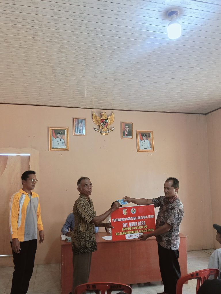 TULANG BAWANG – Pemerintahan Kampung (Pemkam) Tri Tunggal Jaya, Kecamatan Banjar Margo, Kabupaten Tulangbawang, Provinsi Lampung, menyalurkan bantuan langsunglangsung tunai (BLT) dana desa (DD) tahap Tiga periode Juli, Agustus dan September tahun 2025 di aula balai kampung, Kamis 18 September 2025.